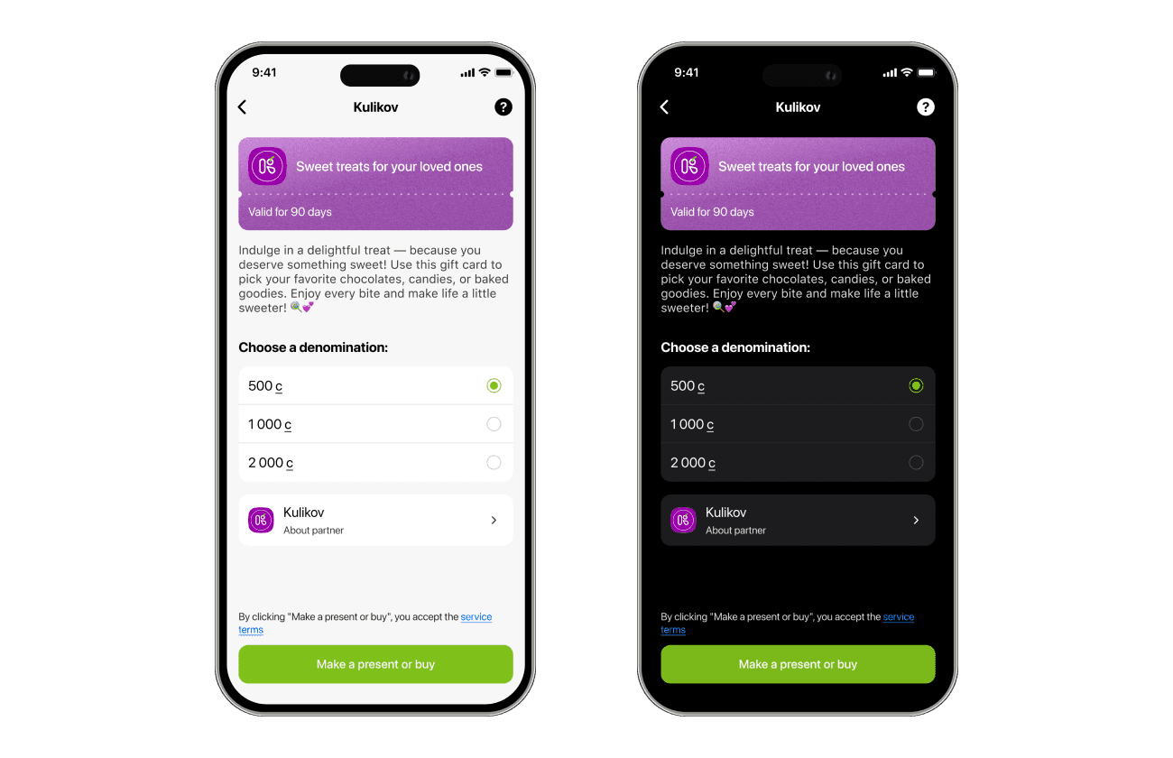 Together with the product manager we determined all the possible types of gift cards, their logic and appearance. To achieve the final result I went through enormous options and variations of colors, illustrations, techniques by collecting and processing feedback.
