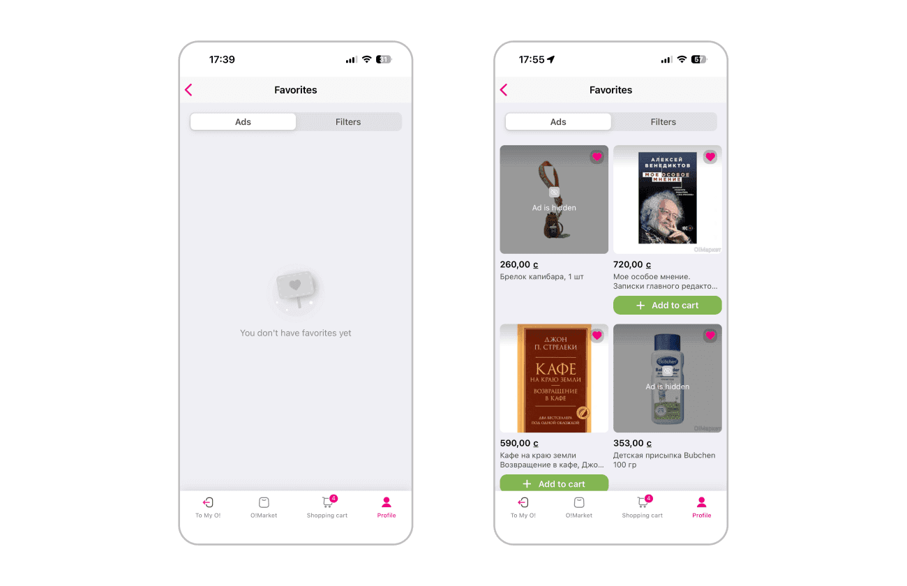 Favorites section was also oriented on C2C. I redesigned its empty state: created a cute cat illustration, added CTA leading to the catalog and personalised feed with recommendations for the customer.