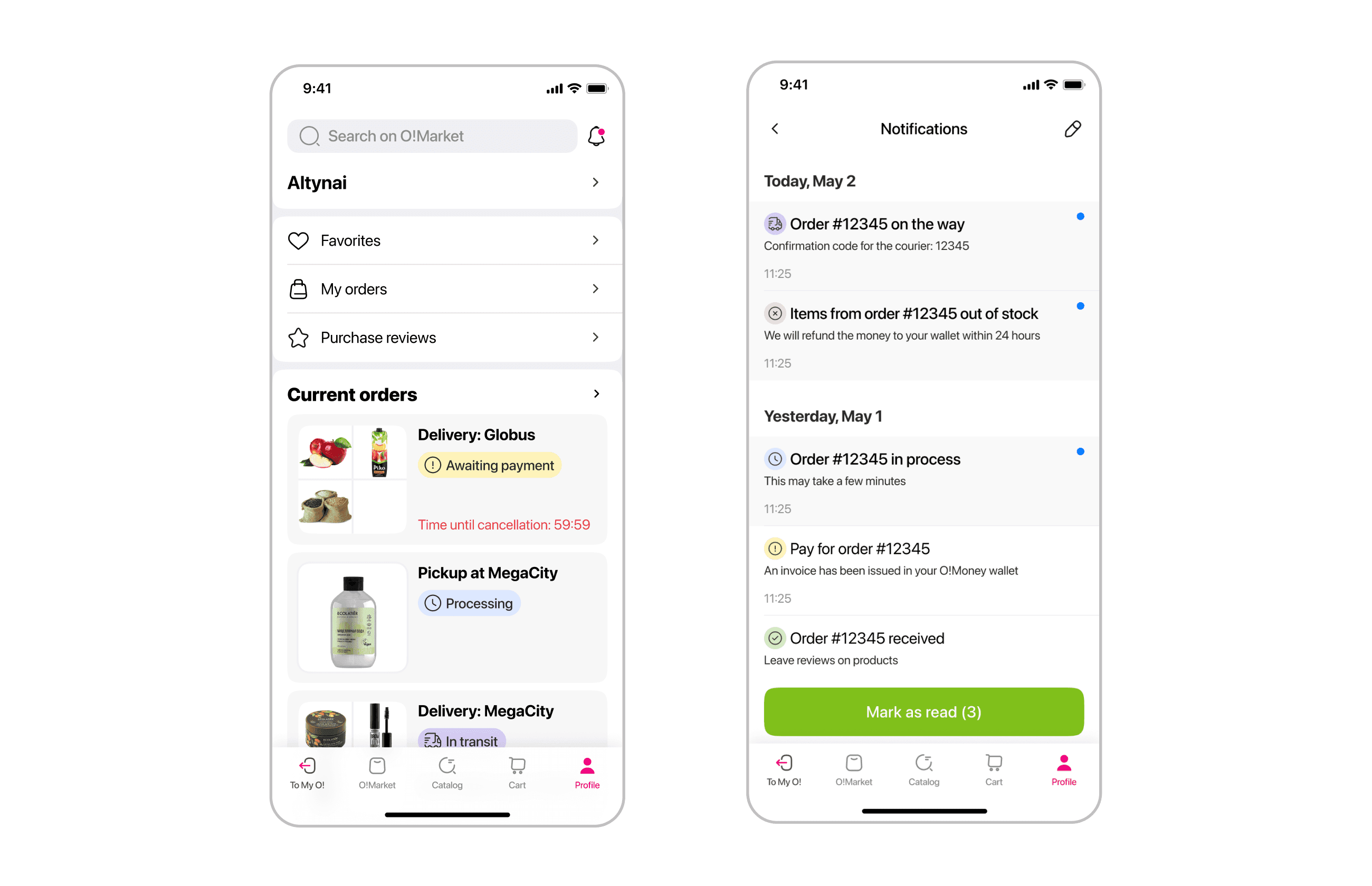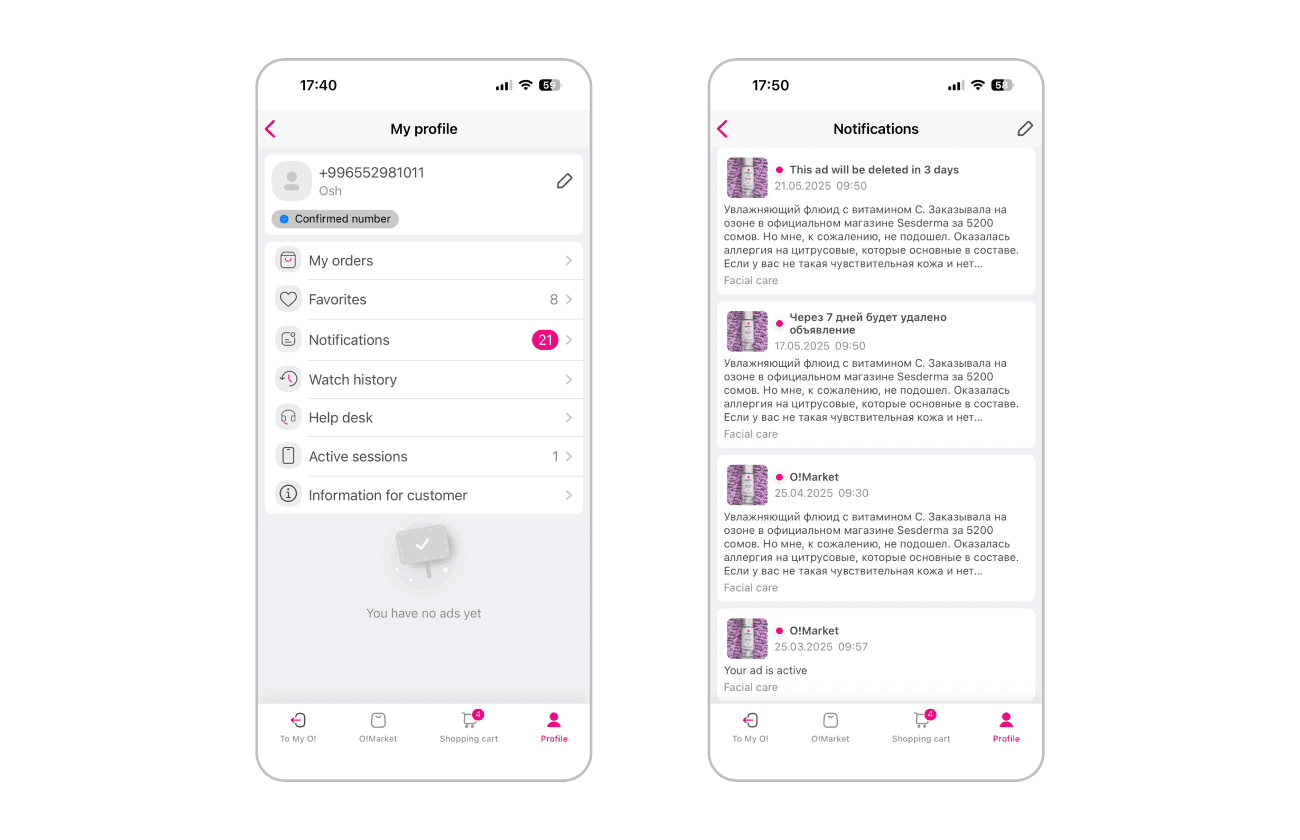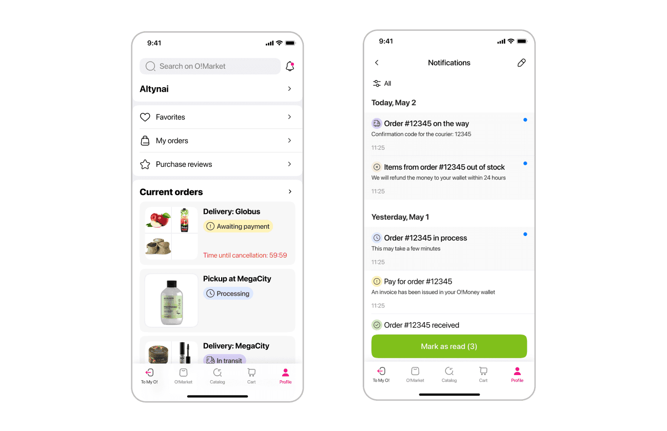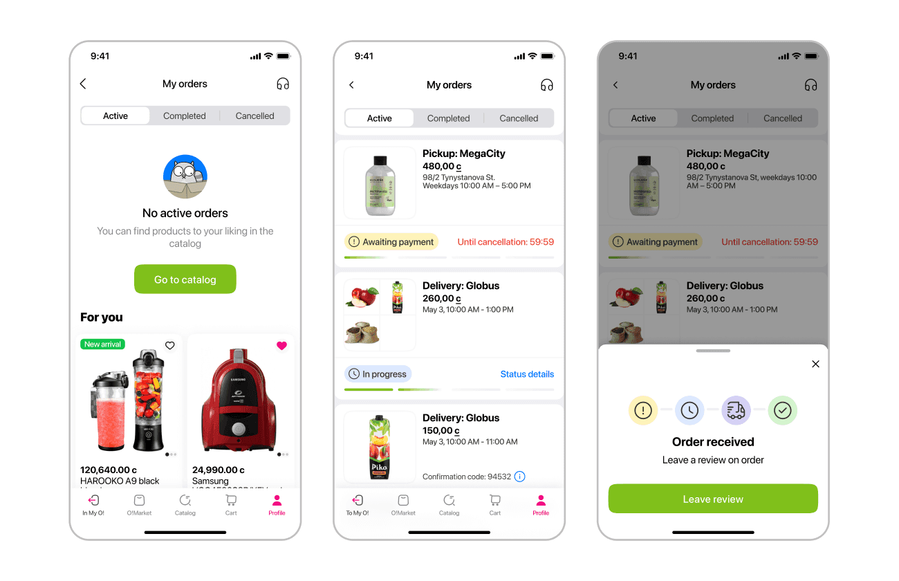 Thus, old O!Market required full reconstruction, strategy revision and, of course, redesign. The platform had its own particular designer. I joined the project to help her and to meet the deadline. So, as a part of total redesign I was in charge of profile section, including user's orders, favorites, notifications and reviews.