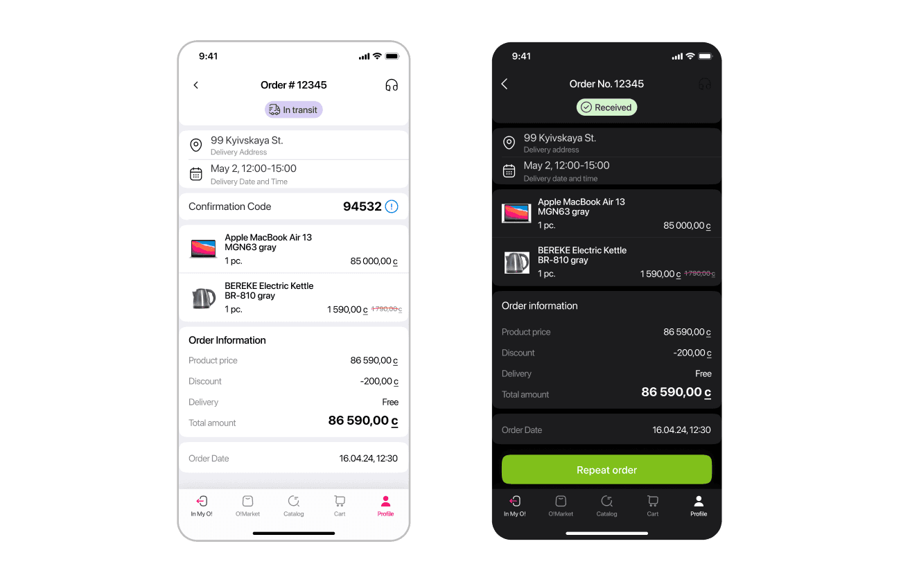 The whole design of order statuses was shabby and old-fashioned. There were a lot of order statuses and it was difficult for the user to navigate through them. I reduced them from 8 to 4 and illustrated all the steps with minimalistic icons: